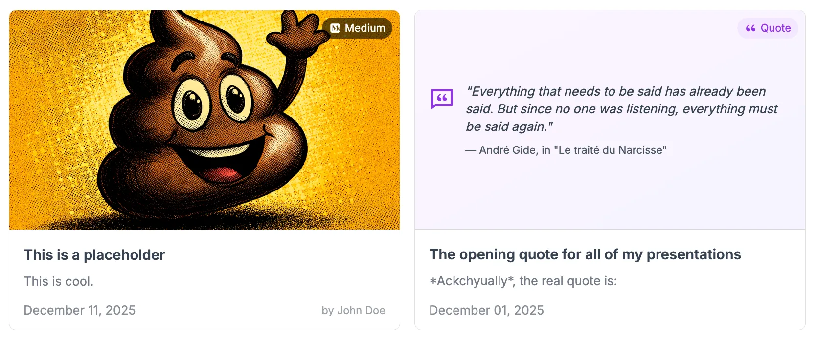 - an open platform (bluesky, linkedin, substack, or any other websites) in which case the card will display its icon, as well as an image from the article, and the author. Most of it is automatically parsed with Obsidian Web Clipper. I’ll document this workflow at some point.