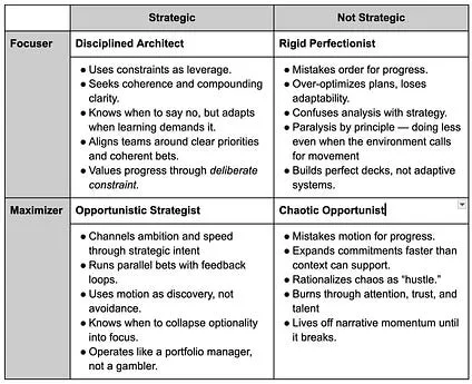 “Focusers are biased to focus, coherence, depth, meaningful constraints, doing less for more, sequential experiments, intentionality, sustainability, “What matters most?”, compounding clarity. Focusers are comfortable with abstraction. A clear constraint or principle is enough to guide them. “Stop mistaking chaos for progress.” “Stop overdoing.""